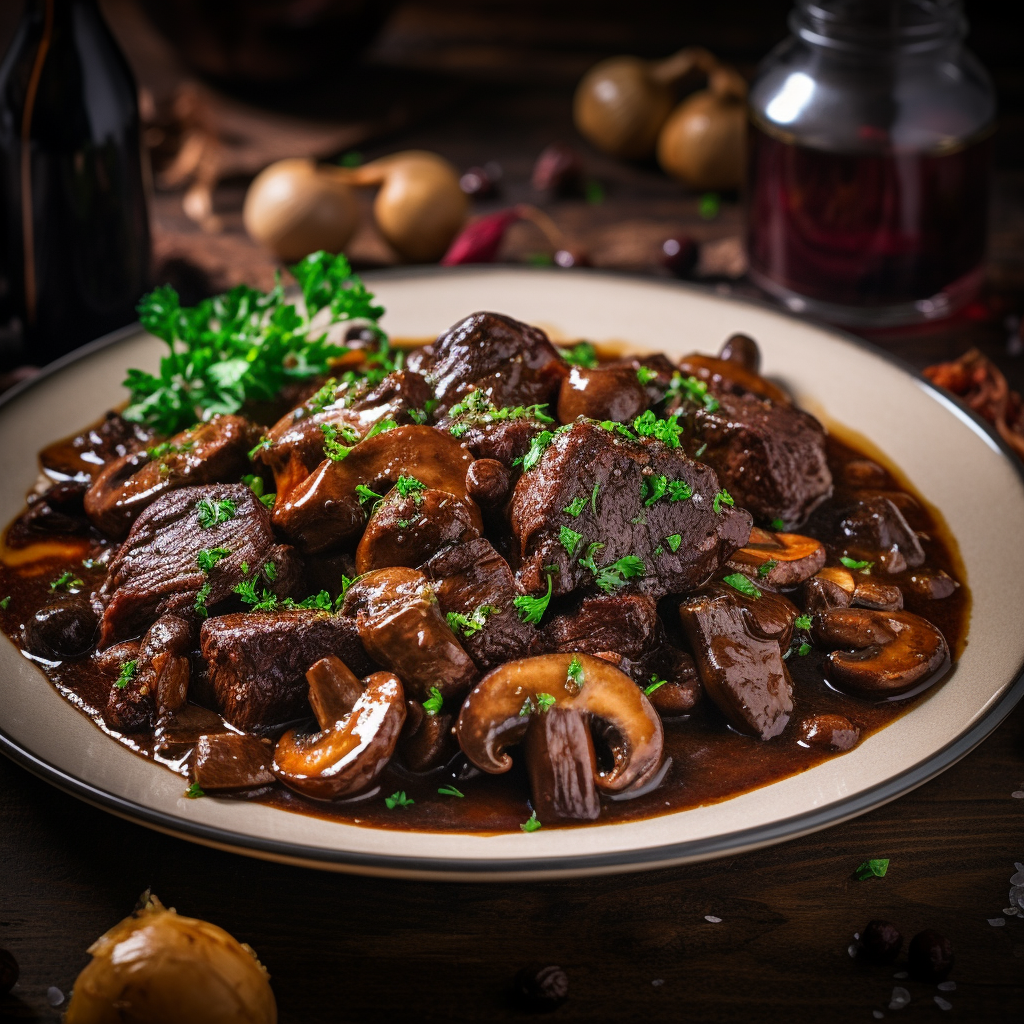 Bœuf Bourguignon is a traditional French stew made of beef braised in red wine, typically a red Burgundy, and beef broth, usually flavored with garlic, onions, and a bouquet garni, with pearl onions and mushrooms added towards the end of cooking.