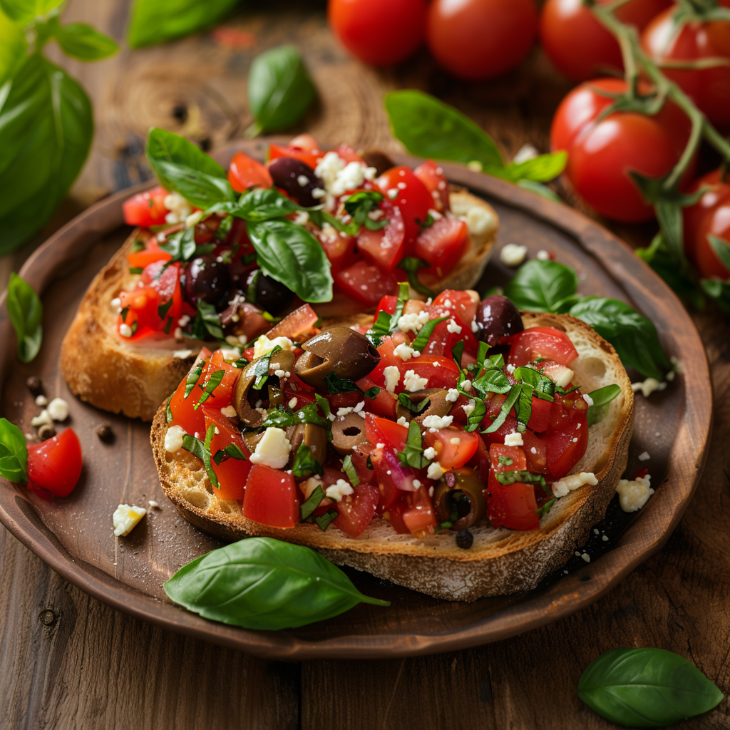 This dish combines the fresh flavors of tomatoes, basil, olives, and feta cheese on crispy toasted bread. It's perfect for a light snack or as a starter for a Mediterranean-themed meal.