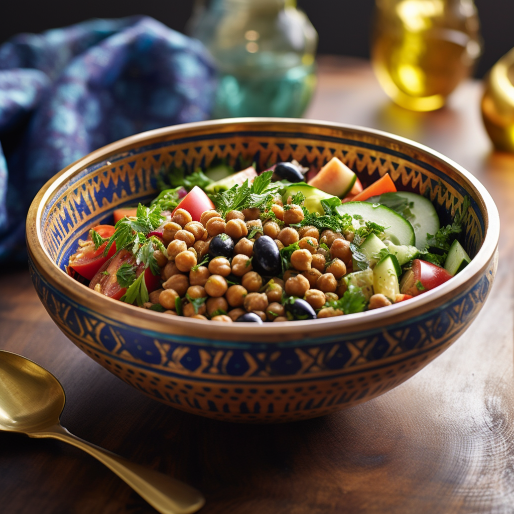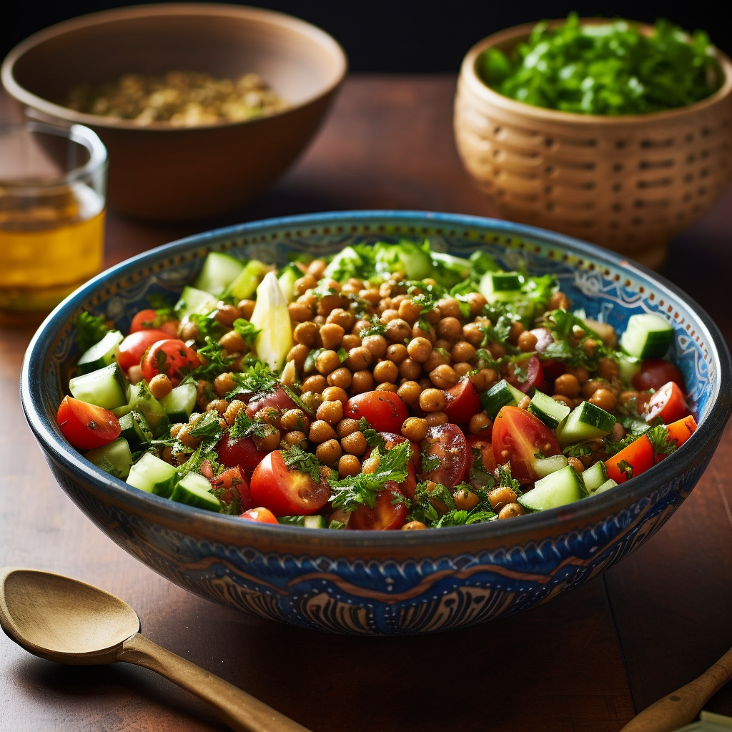 Dive into the heart of the Mediterranean with our Spiced Chickpeas & Fresh Vegetable Salad prepared with love! This dish masterfully combines the nutty richness of roasted chickpeas, lovingly coated in an aromatic blend of spices, with the crisp freshness of garden vegetables.