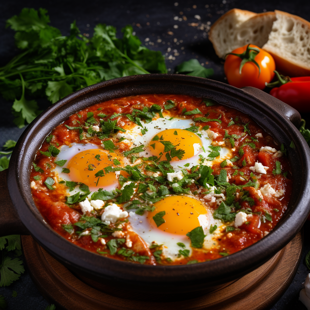 Shakshuka is typically served in the pan it's cooked in, and it's best enjoyed with a slice of crusty bread or pita to scoop up the sauce and eggs.