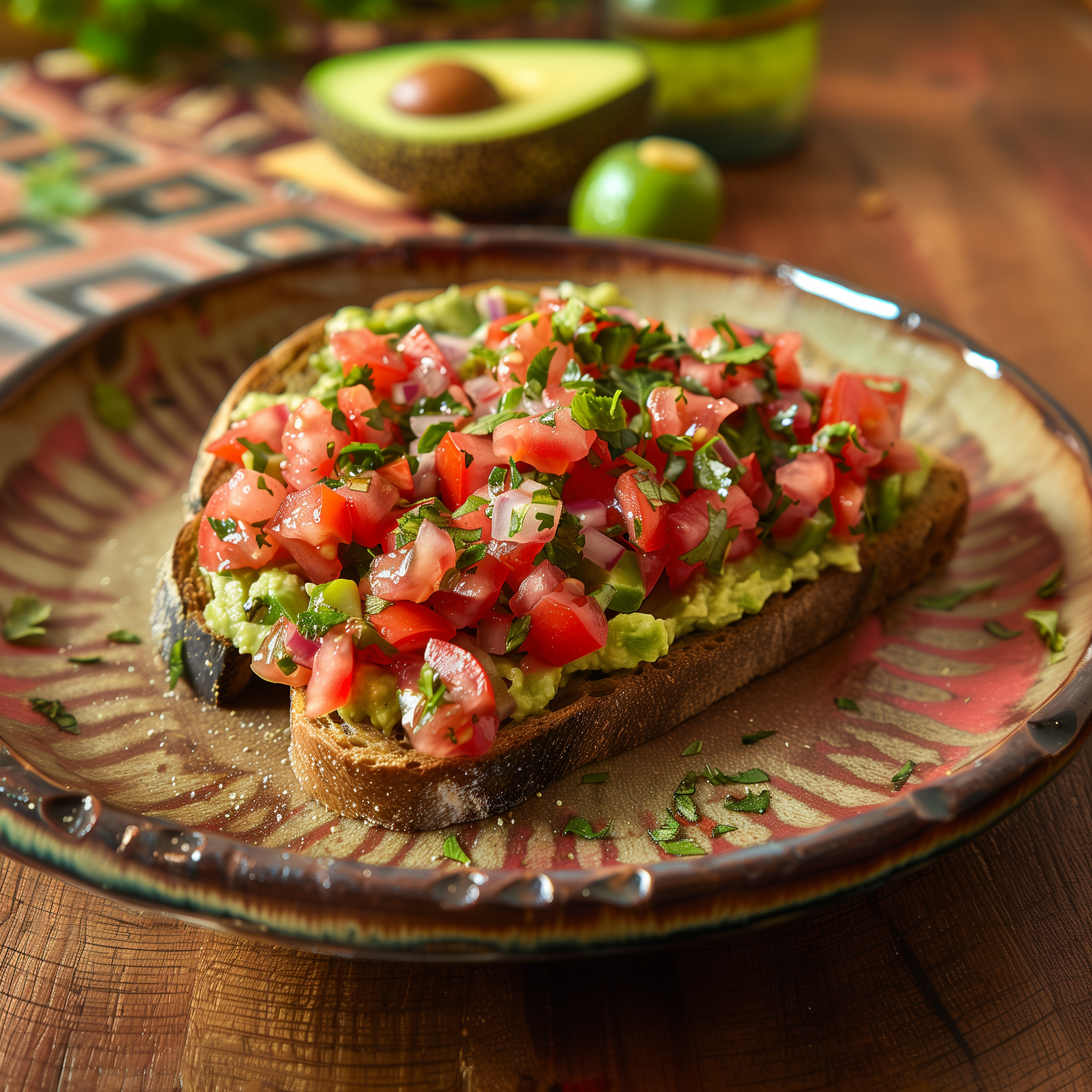 There you have it—a delightful fusion of creamy avocado butter and vibrant tomato salsa atop crusty sourdough that perfectly encapsulates the fresh, aromatic flavors of the Mediterranean. This dish not only pleases the palate but also adds a touch of elegance to your table. Enjoy this luscious spread with friends and family, or savor it solo as a special treat. Bon appétit!